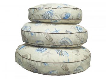 Sea shells by the sea shore, is the theme for our Coral Beach Blue collection of luxury round dog beds in shades of blue, taupe, and ivory. Oh, how your pup will while away the hours either curled up or stretched out on this comfy bed!